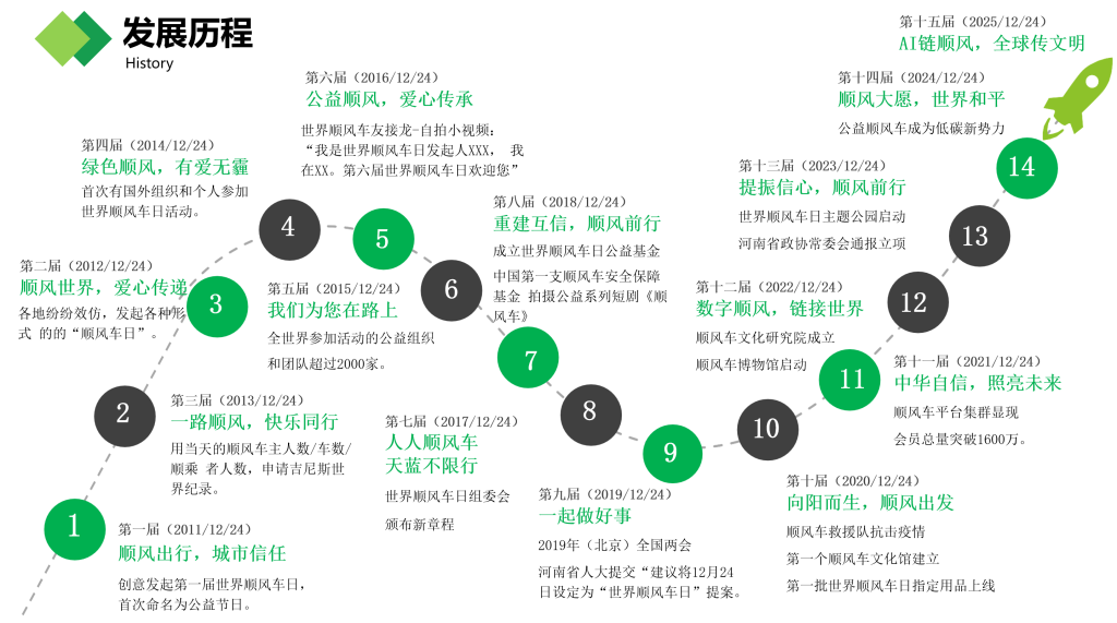 历史传承 历届主题回顾 第一届世界顺风车日(2011/12/24) 主题:顺风出行,城市信任。第二届世界顺风车日(2012/12/24) 主题:顺风世界,爱心传递。第三届世界顺风车日(2013/12/24) 主题:一路顺风,快乐同行。第四届世界顺风车日(2014/12/24) 主题:绿色顺风,有爱无霾。第五届世界顺风车日(2015/12/24) 主题:我们为您在路上!第六届世界顺风车日(2016/12/24) 主题:公益顺风,爱心传承。第七届世界顺风车日(2017/12/24) 主题:人人顺风车,天蓝不限行第八届世界顺风车日(2018/12/24) 主题:重建互信,顺风前行第九届世界顺风车日(2019/12/24) 主题:一起做好事第十届世界顺风车日(2020/12/24) 主题:向阳而生,顺风出发第十一届世界顺风车日(2021/12/24)主题:中华自信,照亮未来。第十二届世界顺风车日(2022/12/24)主题:数字顺风,链接世界。第十三届世界顺风车日(2023/12/24)主题:提振信心,顺风前行。第十四届世界顺风车日(2024/12/24)主题:顺风大愿,世界和平。第十五届世界顺风车日(2025/12/24)主题:AI链顺风,全球传文明。 历届之最 2025年 第十五届世界顺风车日构建顺风车AI链平台集群,筹备顺风车稳定币 2024年 第十四届世界顺风车日 顺风车AI数字人–首个顺风娃诞生 2023年 第十三届世界顺风车日 世界顺风车日文化主题公园,河南省政协常委会通报立项 2022年 第十二届世界顺风车日首个顺风车博物馆项目启动,世界顺风车日数字化链平台集群建成规模 2021年 第十一届世界顺风车日抗击疫情,捐赠物资达24吨世界顺风车日文化研究院成立公益顺风车友突破1600万人 2020年 第十届世界顺风车日第十届全国顺风雷锋评选活动,全国参加评选的人数达到45万人。其中有33名获得全国顺风雷锋荣誉勋章。 2019年 第九届世界顺风车日北京的全国两会上,河南省人大将世界顺风车日作为河南省公益名片委派人大代表郅慧向大会提交”关于将12月24日设立为世界顺风车日的建议“的提案。 2018年 第八届世界顺风日最早以《顺风车》公益系列短剧的模式,定义顺风车的各个元素。参与车友人数最多一次,突破15万人。 2016年 第六届世界顺风车日最多车友参与录制小视频,喊出“我是世界顺风车日发起人!” 2015 第五届世界顺风车日全世界参加活动的组织突破2000家。 2014年 第四届世界顺风车日首次有国外组织参加活动。 2013年 第三届世界顺风车日从这一届开始,用参加顺风车活动三个数字:车友人数,私家车数、顺乘者人数。首次创造一个顺风车的吉尼斯世界记录。 2011年 第一届世界顺风车日简述:活动当天能聚集一千多辆车,从两万多元的昌河面包车,到上千万的法拉利都有。郑州CBD整个内环路是一个圆圈,如意湖畔的会展路两侧是个大型停车场,车位和路上停满了参加第一届世界顺风车日的车辆。大家热情高涨,为中国能发起这样一个有意义有趣味又满满正能量的公益节日而兴奋。最有意思的是,出发的车辆把商务内环路环绕了一圈。领队头车已经出了内环到达外环,停车场里还有很多车还没出发。很多车友回忆说:这是他们第一次见到的最开心最热烈的车辆最多的民间自发的公益活动